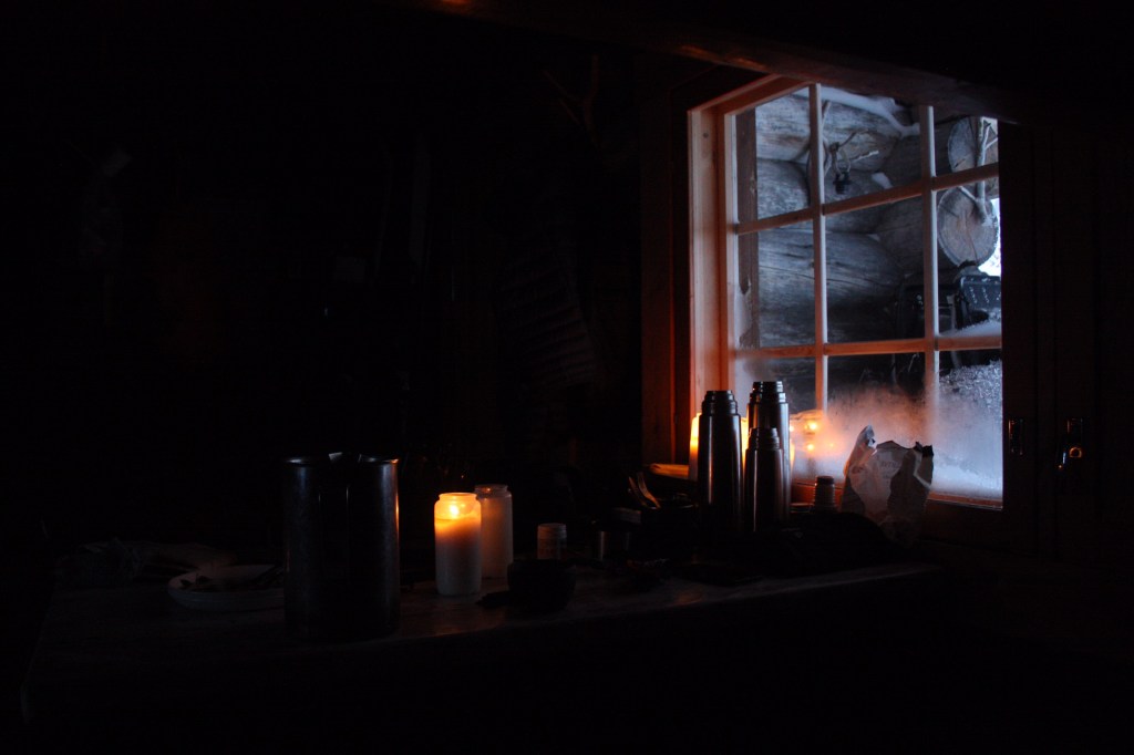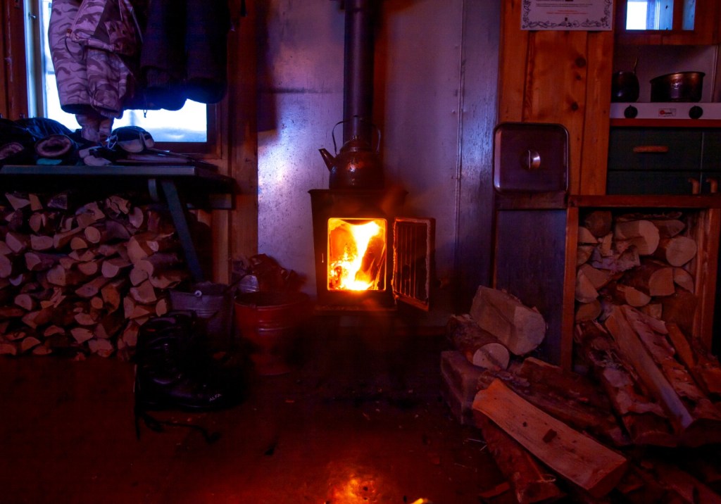 Nach einem langen Tag an der frischen Luft, möchte man dann am liebsten erschöpft einfach nur ins Bett fallen. Zuerst muss aber ein Feuer angezündet und Holz aus einer der Nachbarhütten reingetragen werden. Sich einfach auf die Toilette setzen ist auch nicht, dafür müssen sich erstmal Winterschuhe und Hose und eine warme Jacke angezogen werden, denn die Trockentoilette befindet sich meistens 30 Meter von der Schlafhütte entfernt. Zum Glück heizt der kleine Kamin schnell ordentlich ein und nach etwas Warten und auspacken der Kerzen und Schlafsäcke, kann man sich dann doch noch etwas ausruhen bevor es ans Abendessen kochen geht.
